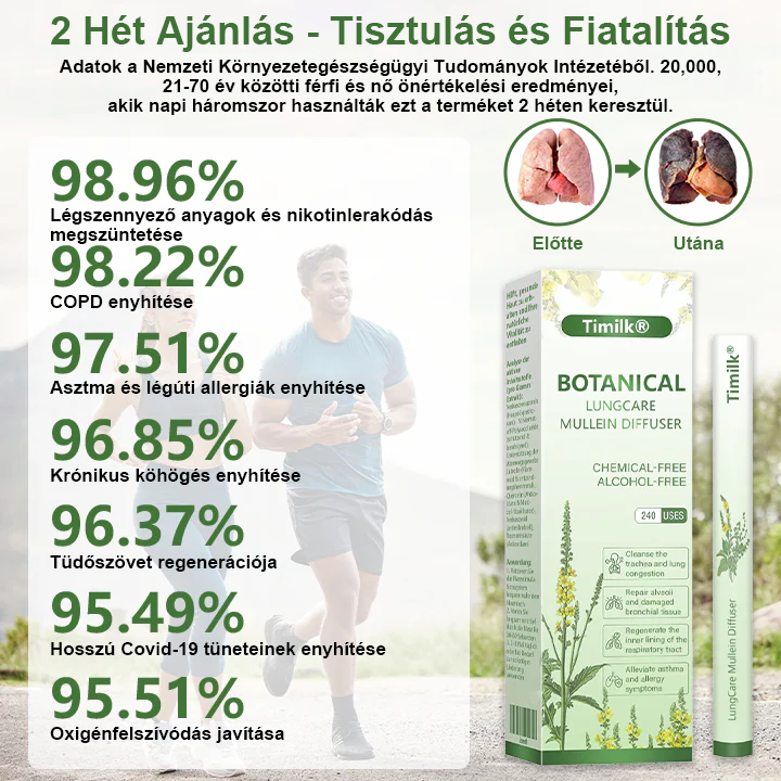 De a Timilk® Diffuser-t kipróbáló emberek 94%-a már 2 percen belül jobban érezte magát. Négy hét után újra könnyedén lélegeztek — nincsenek pirulák, nincs mellékhatás, nincs drága orvosi látogatás. A tüdődnek most van szüksége segítségre. Ne várj, amíg túl késő lesz.
